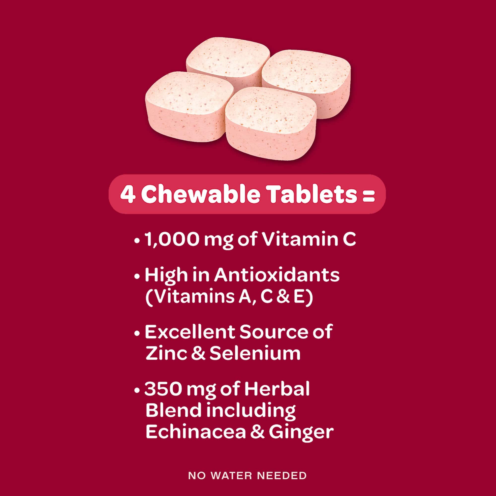 Airborne Chewable Tablets have a crafted blend of Vitamin C and 13 vitamins. minerals and herbs to help support your immune system in a great-tasting and easy-to-take form; no water needed*. Each serving (4 tablets) provides 1000 mg of Vitamin C.